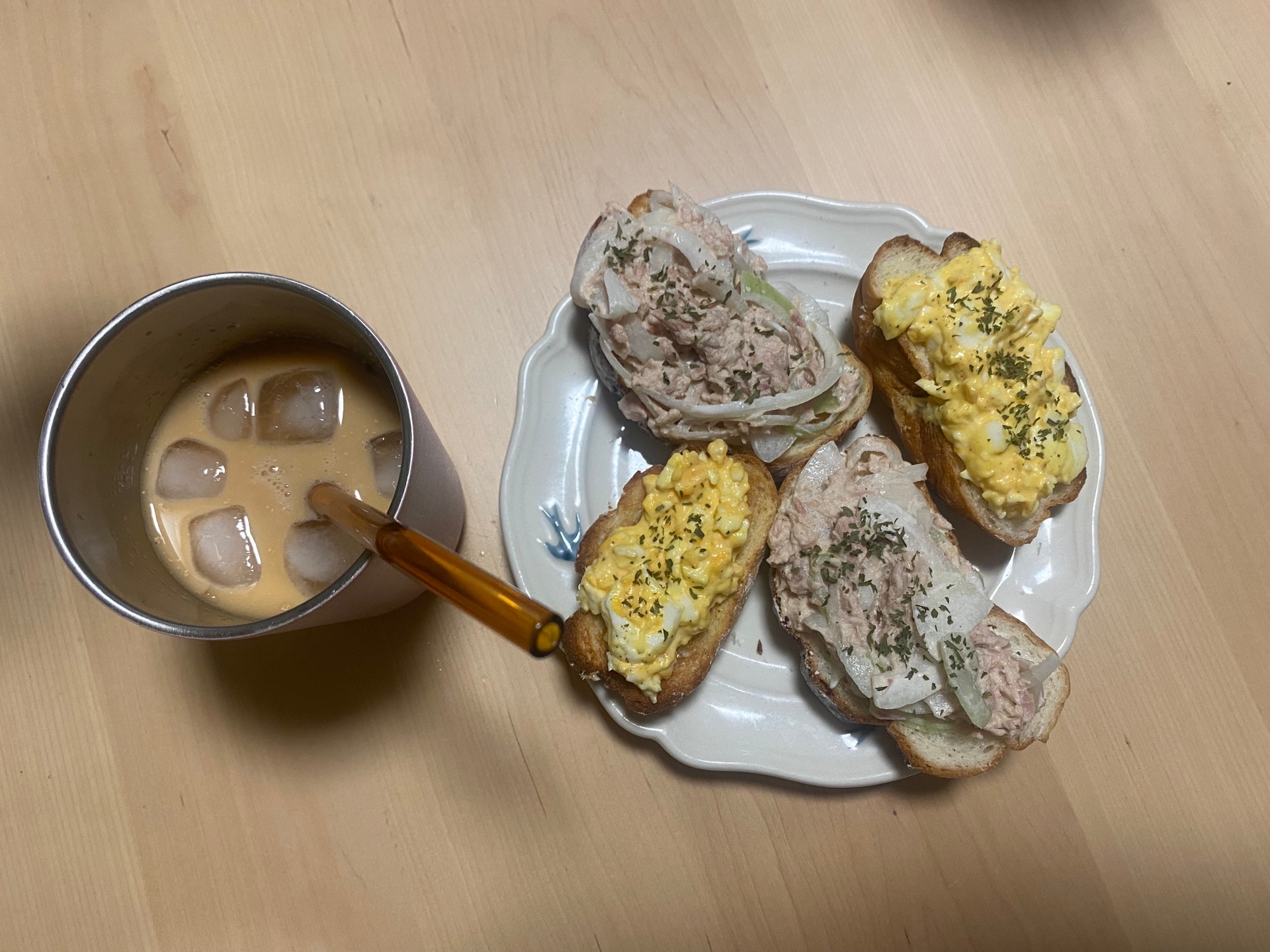 映える写真でなく恐縮ですが(ストローが画面を飛び出し3Dのよう)、卵パンとツナマヨパン、これまだお友達からいただいたベトナム?タイ?のインスタントミルクティーと一緒に🙏